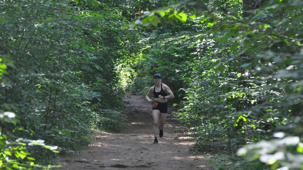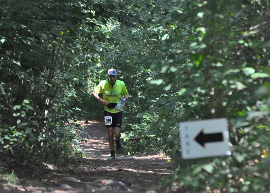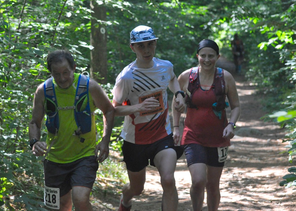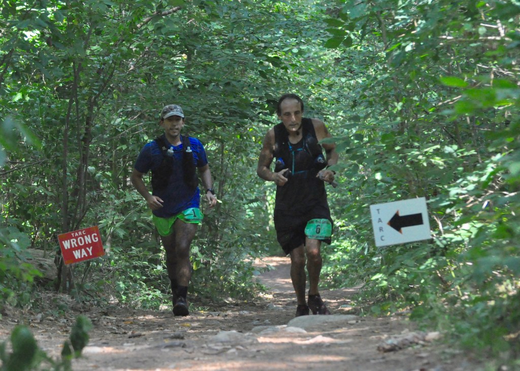 Both Agront and Catarius were among the 17 starters of the 40-mile race. Another 21 runners started the event’s other ultramarathon offering, a 50K race. On a hot and sticky day where temperatures climbed from the upper 70s at the start to the mid-90s by the afternoon and the tree canopy turned the trails into a sauna, just eight runners ultimately finished the 40-miler and 21 completed the 50K including four drop-downs from the 40-miler.