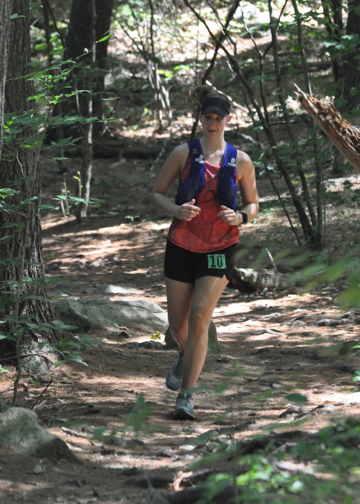 Patrick Caron led the race wire to wire. The native of nearby Needham, Mass., pulled away from the pack within the first mile with his sights set on finishing in less than 1:10. He did so with seconds to spare, winning in 1:09:58. For Caron, it marked his latest victory in a string of shorter distance races. He won the Trail Animals’ Blue Hills Skyline Run 12K by a 7-minute cushion in June.