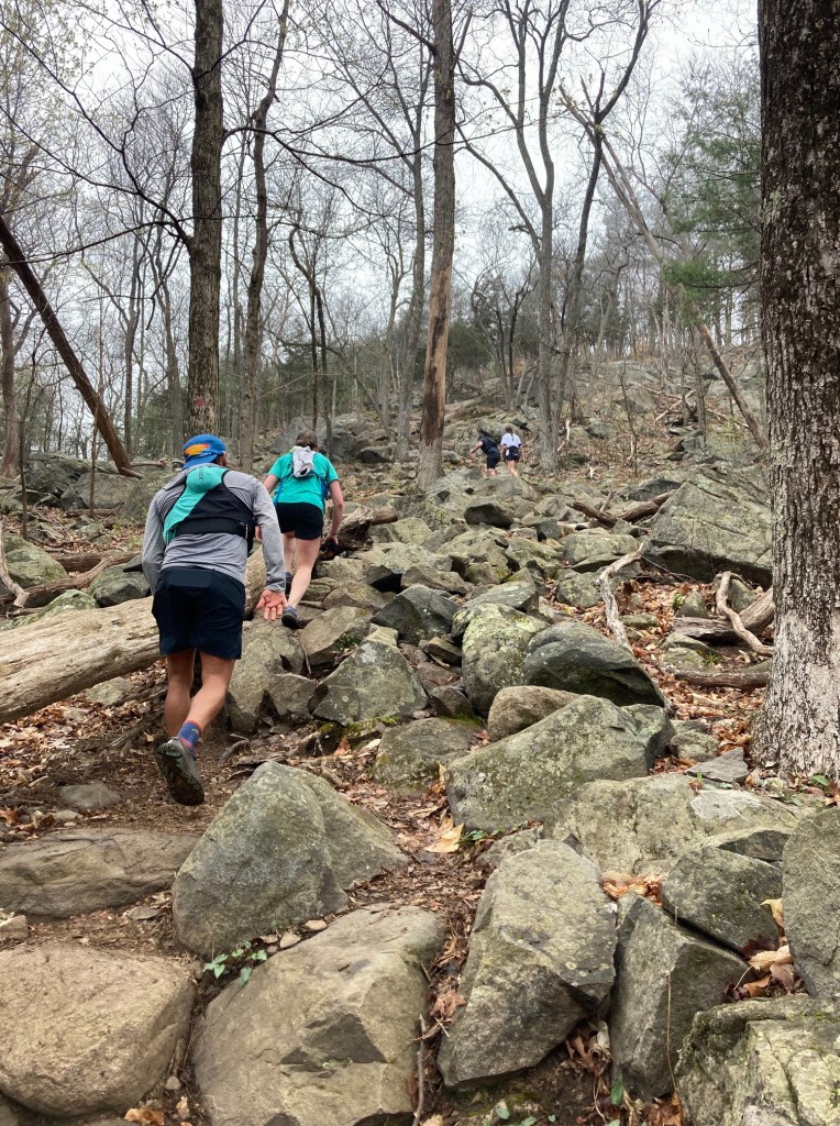 About 2 1/2 miles into the run, they crossed paths with the lead runners from the 6 a.m. start – five of them were attempting the 14th edition of the DRB 50-mile. After another mile, the group took a sharp left off of one of the rocky fire roads and made a steep ascent up a hard-to-spot trail. It was the first of many tricky to find, oftentimes unmarked trails on Breinan’s course. That’s the first point where runners often miss a turn and get lost, and it’s where the pack of runners started to spread out.