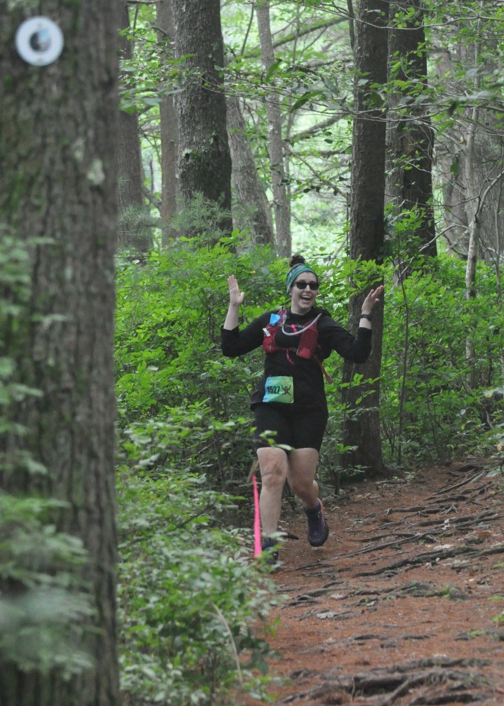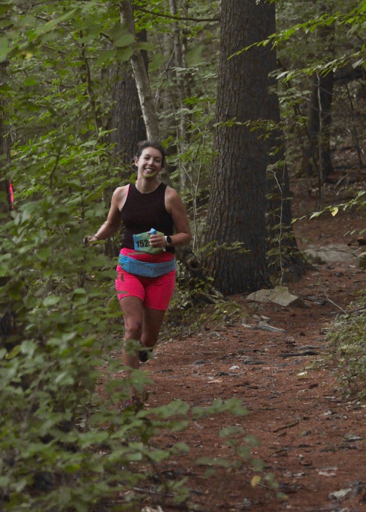 Kimberly Lynch was feeling good as she neared the finish line of the 10-mile race at the 2024 TARC Summer Classic at Noon Hill Reservation. Photo by Chris Wristen/MassUltra.