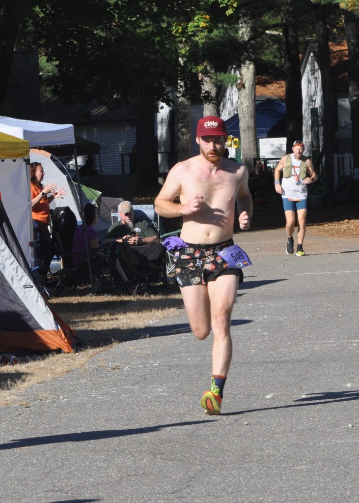Galen August races back into Camp Tevya as part of a relay team at the 2024 Ghost Train Trail Race. August’s team cranked out 175 miles of running during the 30-hour event. Photo by Chris Wristen/MassUltra.