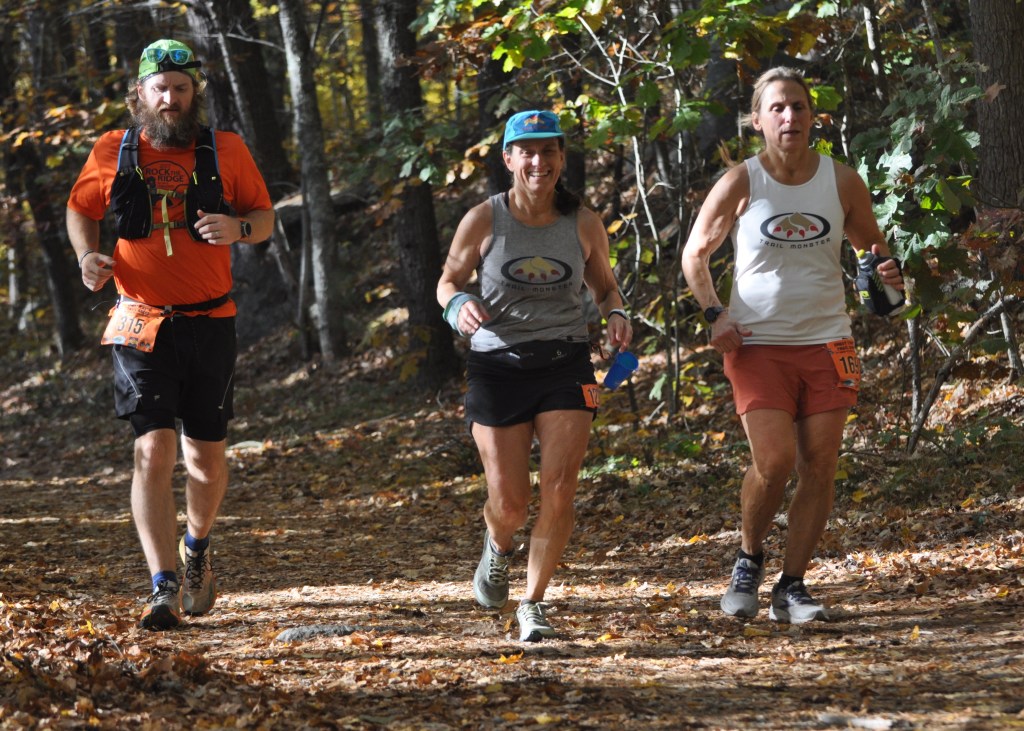 Trevor Rank, left, Rachael Flaxman, center, and Susan Haversat, right, crank out the miles at the Ghost Train Trail Race. Photo by Chris Wristen/MassUltra.