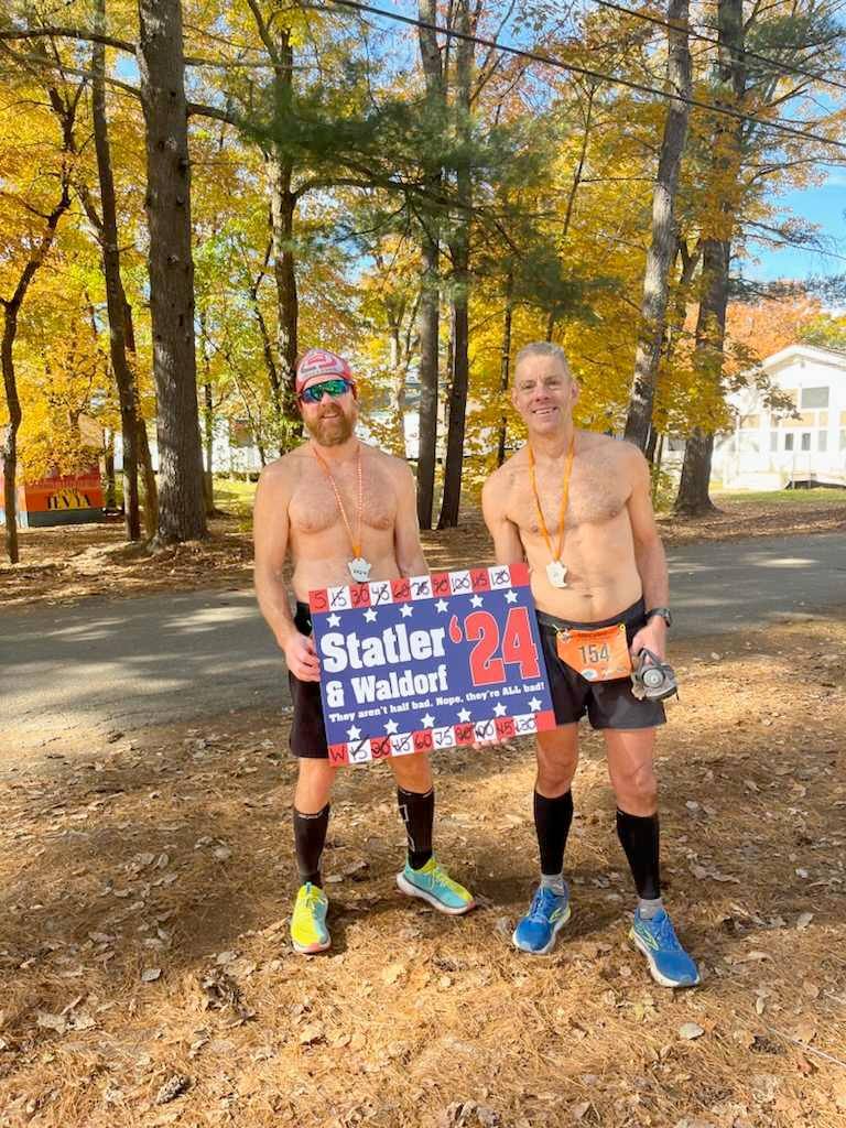 They weren’t shy about their goal. At 59 and 55 years old, respectively, Godzinski and Warren jokingly refer to themselves at Statler and Waldorf – the cranky, elderly heckling characters from The Muppet Show – and had a Statler & Waldorf ‘24 campaign sign set up at their camp with check boxes to mark off the mileage as they went, concluding with a box for 130.
