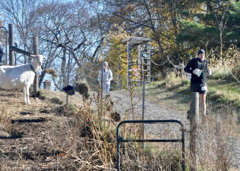 Rob Chizmadia heads back out for another loop of the TARCkey Trot course while one of the Wright-Locke Farm goats looks on. The farm serves as base camp for the TARCkey Trot. Photo by Chris Wristen/MassUltra.