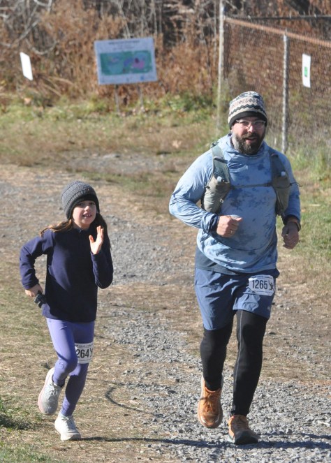Lucy Houlahan, 9, and her dad, Nick Houlahan, climb the final hill of the TARCkey Trot course as they close out another loop. Photo by Chris Wristen/MassUltra.