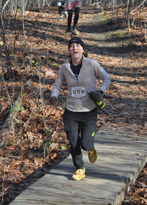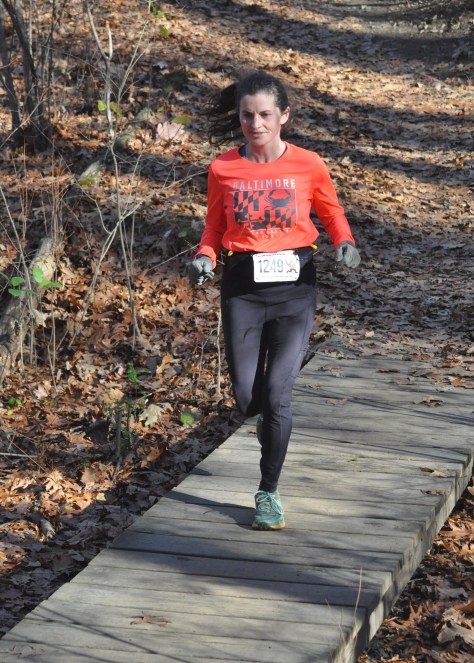 Lynnsey Martin dashes across a bridge of the TARCkey Trot course on Saturday, Nov. 15, 2025. Martin completed six laps for 21 miles and finished second in the female field. Photo by Chris Wristen/MassUltra.