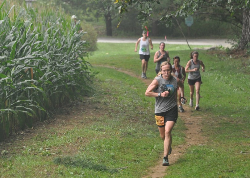 Michelle Boland of Burlington, Mass., leads a pack of runners late in a loop at the 2023 TARC Fall Classic. Boland finished second overall and first-place female in the 50K race. Photo by Chris Wristen/MassUltra.