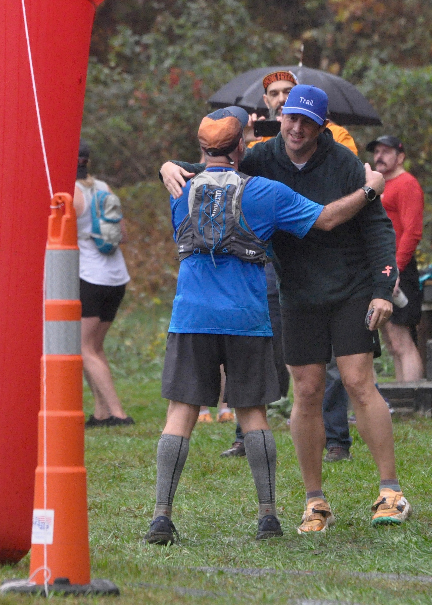 A week after directing the Ghost Train Trail Race in New Hampshire, Rob Fiero closes out the 10-mile race at Womp Romp with a hug from Womp Romp co-Race Director Matt Hoadley. Hoadley had crewed and paced a runner at Ghost Train. Photo by Chris Wristen/MassUltra