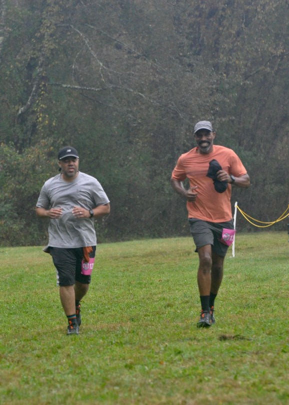 A year after finishing his first 50K at Womp Romp, Dana Searcy of Dorchester, Mass. (right) ran the 10-mile race with Damien Booker of Boston, Mass. It was Booker’s first trail race. Photo by Chris Wristen/MassUltra