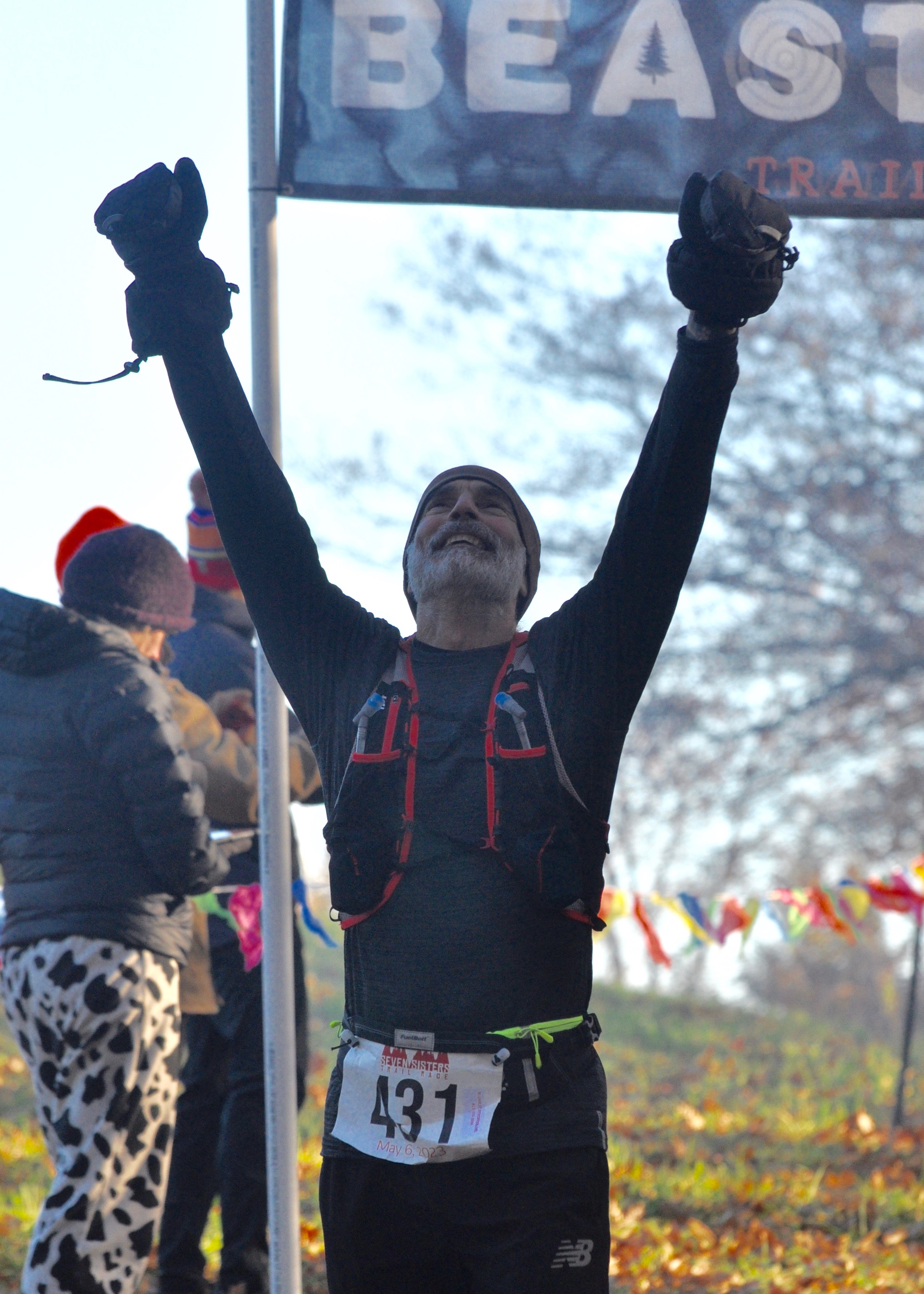 An exuberant Louie Ruvolo completes another loop within the 1-hour time limit at the Race for DFL. Ruvolo completed 15 hours and 62.5 miles before retiring from the Race for DFL. Photo by Chris Wristen/MassUltra