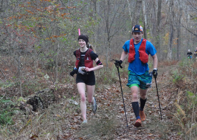 Lila Gaudrault, left, and Mat Ridley, right, share some miles early in the 100K race at the 2023 TARC Stone Cat Trail Festival. Gaudrault earned the overall win and Ridley led the men’s field while finishing second overall. Photo by Chris Wristen/MassUltra.