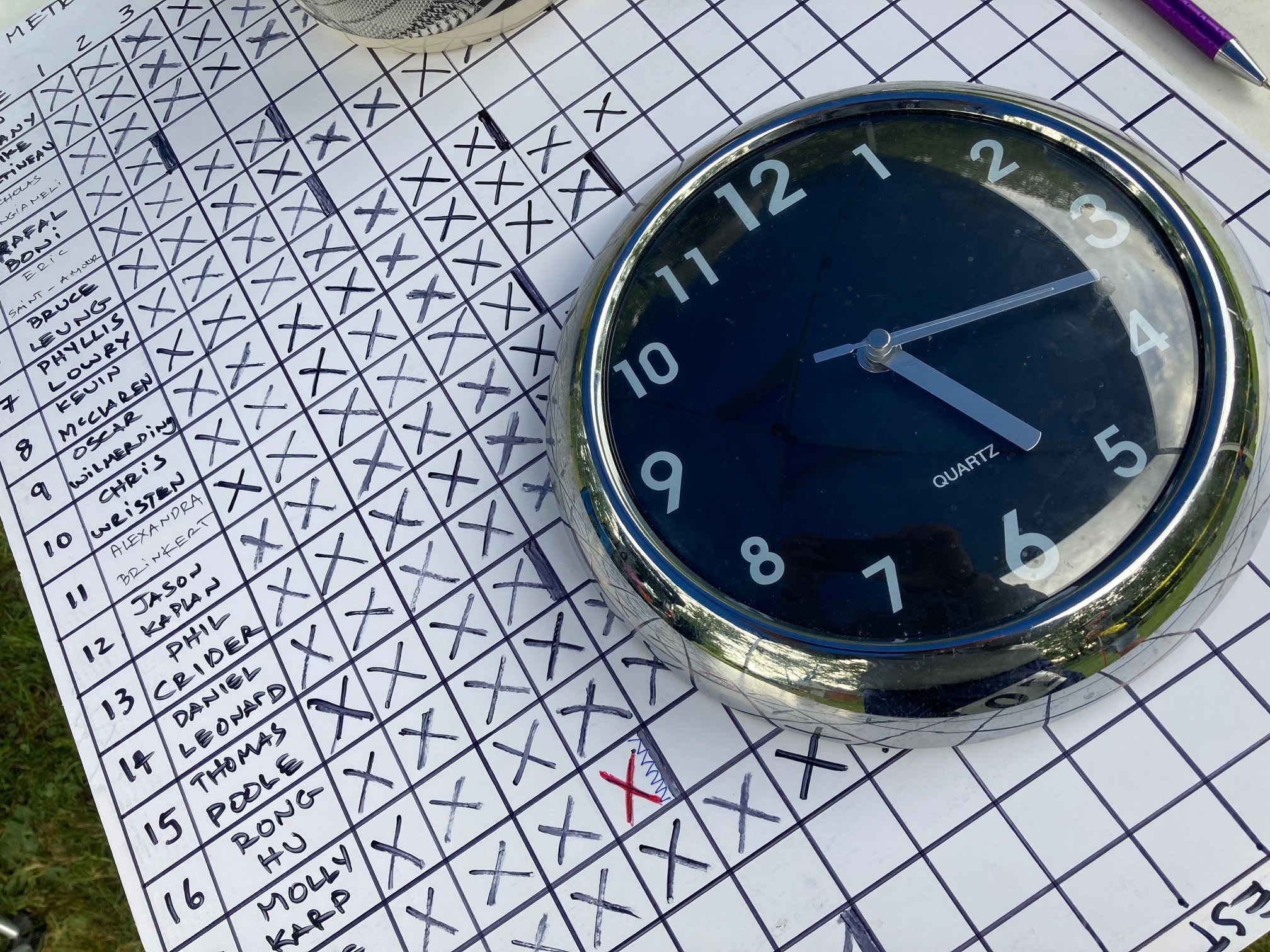 MWBY22 September 19, 2023 2016 × 1512 MWBY22 Kiko Bracker’s kitchen clock provided the official race time at the MetroWest Backyard Ultra. Photo by Chris Wristen/MassUltra.