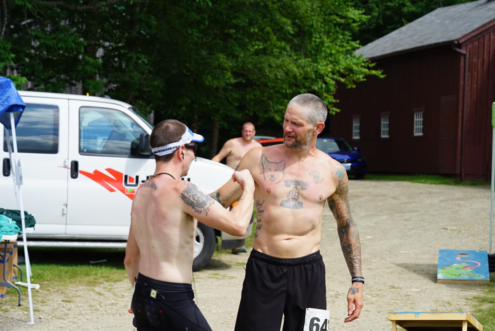 Notchview 23 Bourassa-Pellerin – Benn Griffin photo July 21, 2023 1616 × 1080 Notchview 23 Bourassa-Pellerin – Benn Griffin photo Keith Bourassa, left, and Lee Pellerin, right, congratulate each other after their close race in the men’s 100.7-mile at the 2023 Notchview Ultra. Photo courtesy of Benn Griffin.