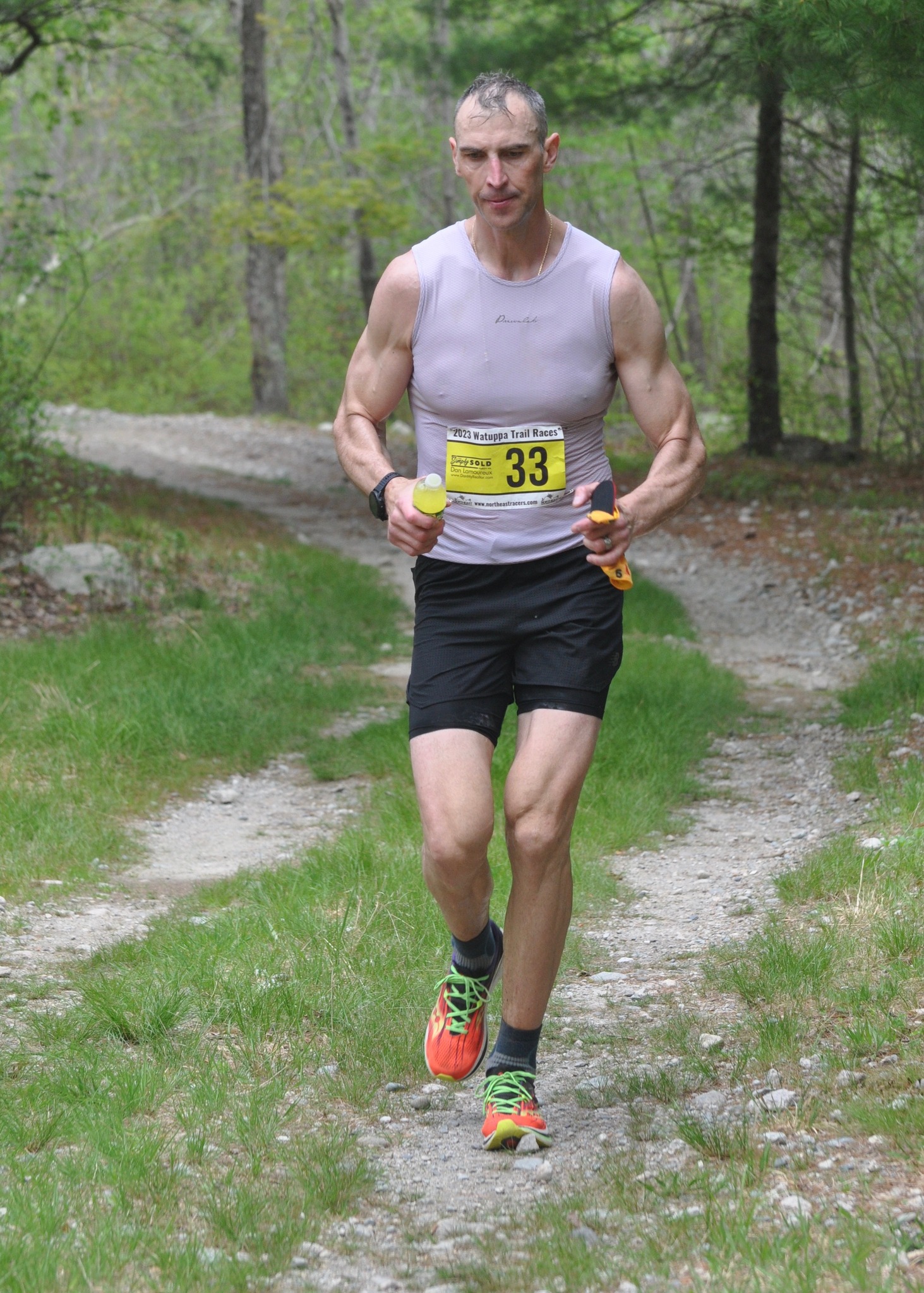 Zdeno Chara dug deep on a hot Saturday and earned his first ultramarathon finish in the 50K race at the Watuppa Trail Races on Saturday, May 13, 2023. Four weeks earlier, Chara ran his first marathon at the Boston Marathon. Photo by Chris Wristen/MassUltra