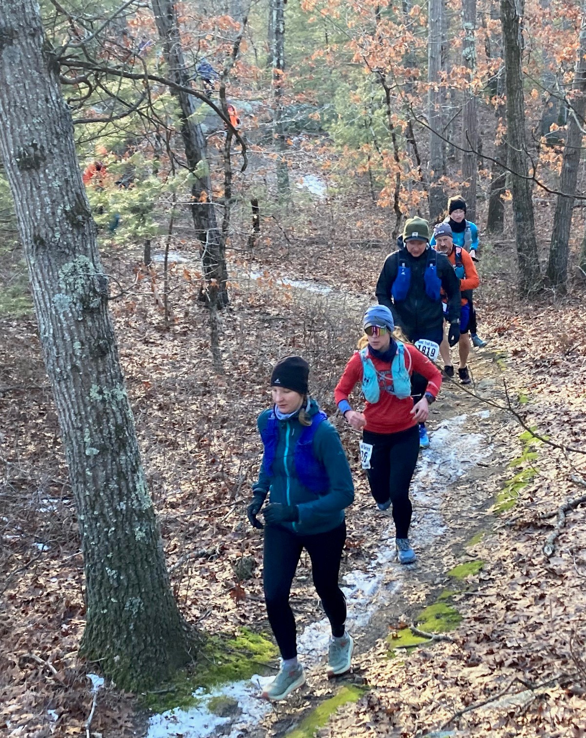 Denise Klatt and Laura Ricci lead a pack of runners through the Red Loop at the 2024 TARCtic Frozen Yeti 30-Hour Ultra. Klatt went on to finish 75 miles while Ricci ran 105 miles. Photo by Chris Wristen/MassUltra